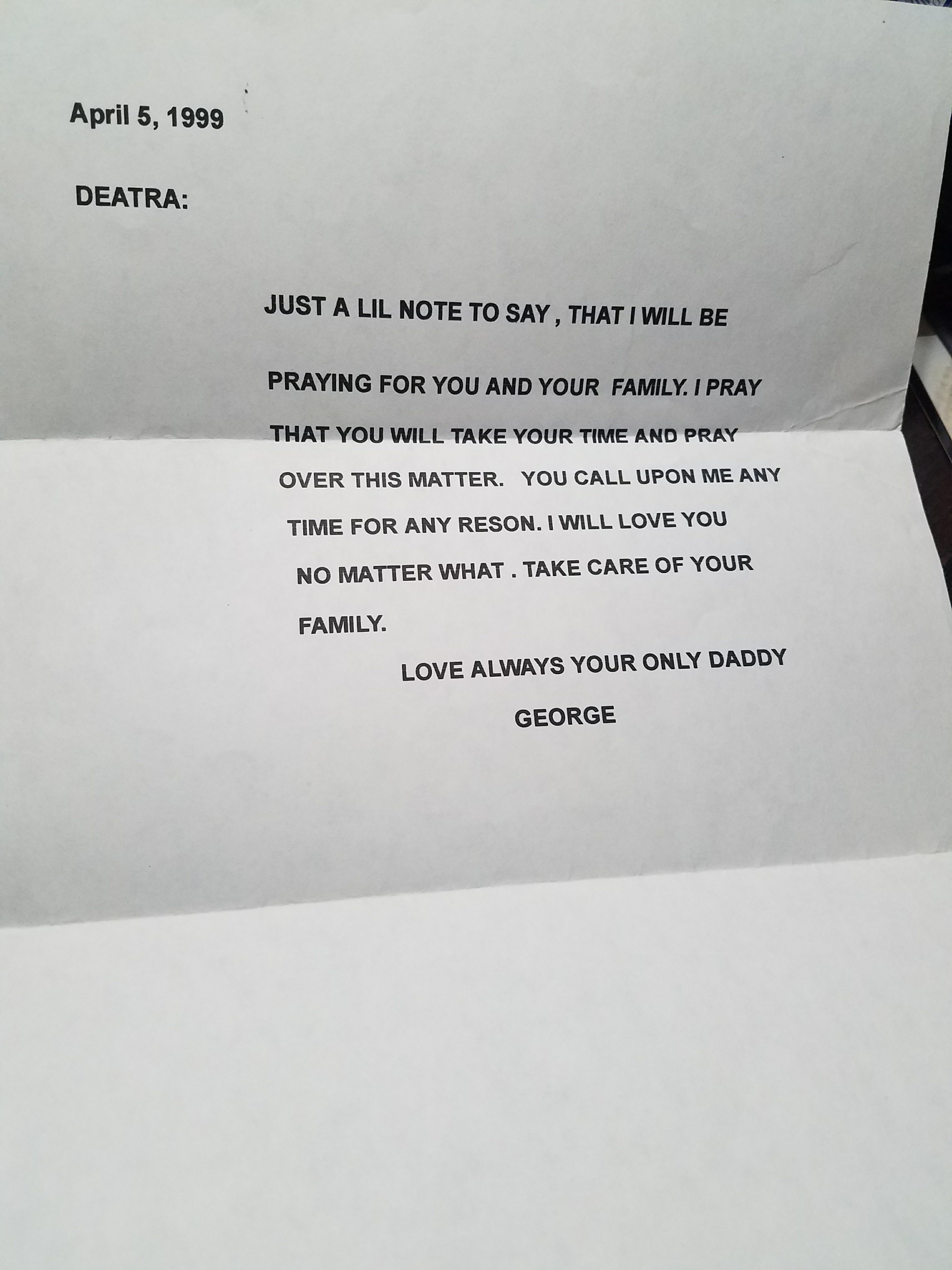Here’s a letter my Daddy sent with some money to help me leave my abusive exhusband, as you read it, he states he loves me and that I can call upon he any time and for any reason and will love me no matter what. I saved the letter since receipt of it on April 5, 1999. This letter was one of his 1st he typed on his home computer.