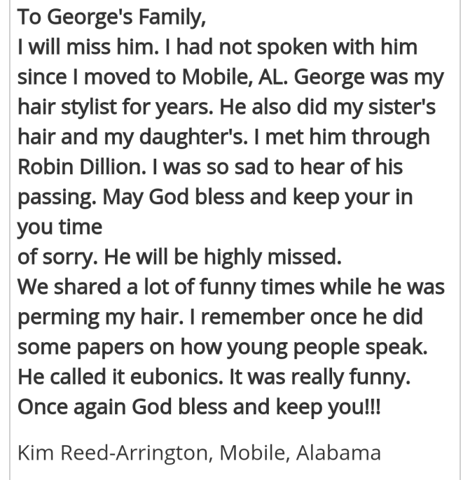 It would be wonderful if his widow is in a good place in life where, if she has a lil trinket or something of my Daddy’s that my son, grandsons and nephew can have, but most importantly I want them to develop a bond with his brothers, nephews and male friends. Well, you know everyone even the women, but the men stand out for me, because as I said my Daddy had girls, his namesake ended with us getting married, with the exception of my George Anthony, who is deserving of more than our version of who he was named after.