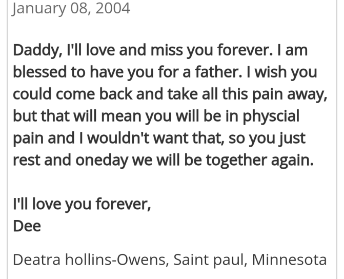 My Momo was still living and we stayed with her throughout our stay, but I thought we would stay with his wife at their house. Initially, we were having a nice time bonding in my Daddy’s hospital room, we talked like girlfriends, I actually enjoyed her company. I noticed a change a few days later. In planning the funeral she offered that my sister and I be involved in furneral arrangements, such as picking out the colors, his suit and etc, everything we suggested was shot down easily, with a sly sounding No, I disagree. We left towards the end, feeling more like unwanted stepkids and even not my Daddy’s girls, but behaved as he would expected even hiding our pain from her.