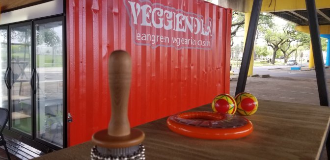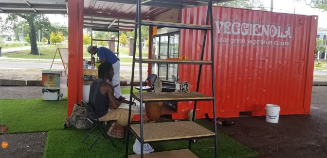 After I walked through the Lafitte Greenway, heading to the Treme 7th Ward Cultural Festival, I could hear the beat of beautiful drumming, which I thought was coming from the festival. As I crossed Claiborne to the bridge, I could see a lone red tin shipping container with the words “Veggie Nola” written in white across it, a colorful deep freezer with the same Veggie Nola logo. I saw the word “Huckabucks” and nearly jumped to the counter hoping it would be the same fruity, sugary syrup frozen cup concoction from my childhood. I would also find the sounds of the drumming were made by one of the owners of Veggie Nola, Tyrone “Brotha T” Henry and his brother Simba Marvin. I have to admit I was happy to see my black brothers in this light and I couldn’t wait to brag about them without knowing them.