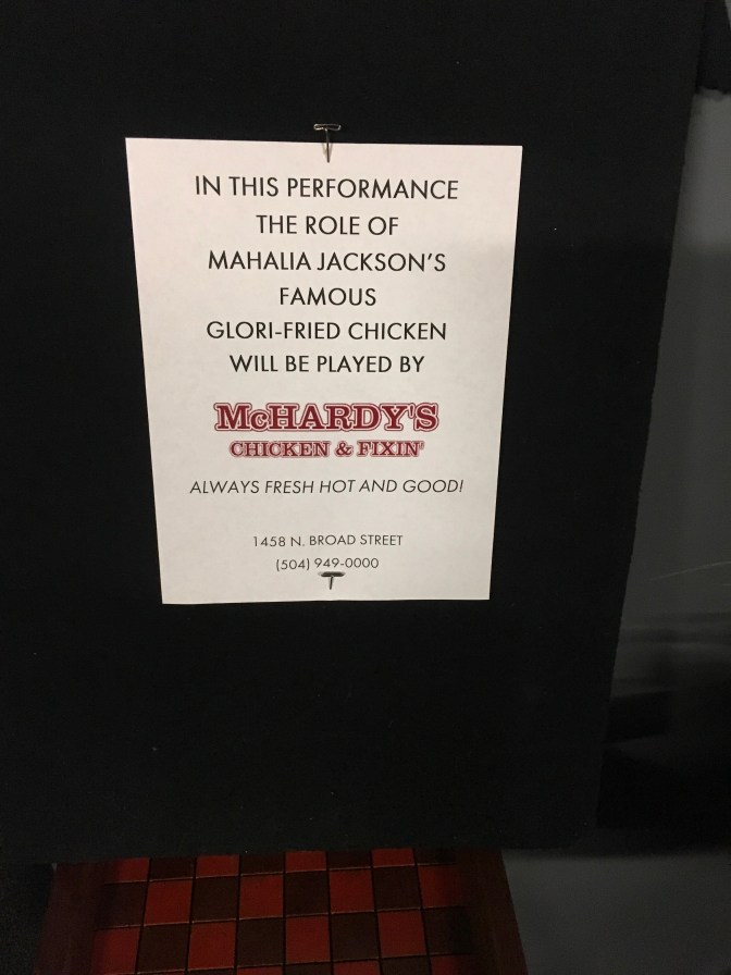 My grandmother, Momo loved Mahalia Jackson like so many other New Orleanians. She was so proud of her accomplishments and typically sang Mahalia Jackson songs as her solos during church services. My Momo never had the opportunity to attend any of Mrs.Jackson’s performances, and the fact that I was there watching a play about Mahalia Jackson made me feel as if I were fulfilling a wish for my Momo.