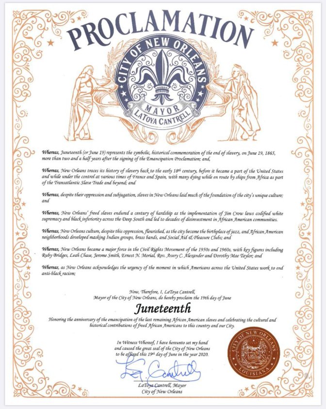 I wonder why it isn’t Juneteenth celebrated on a larger scale in New Orleans, primarily when the city is known to celebrate some of the strangest things. We have festivals for food, a voodoo fest, a Greek Fest, a whiskey fest, and the list of fest goes on. Is it the sensitivity of the issue at hand that has some cringing at the even written word “J.U.N.E.T.E.E.N.T.H? Is it not celebrated as it should, because some think it’s “just for black” as if white people didn’t assist in this life-changing day? Is it hard for some to accept that Slavery did happen by way of their lineage? Can we stop avoiding ” The Talk” about the day African Americans became “real people” to the government? It happened we need to celebrate days, events such as Juneteenth together to prevent slavery from happening again.