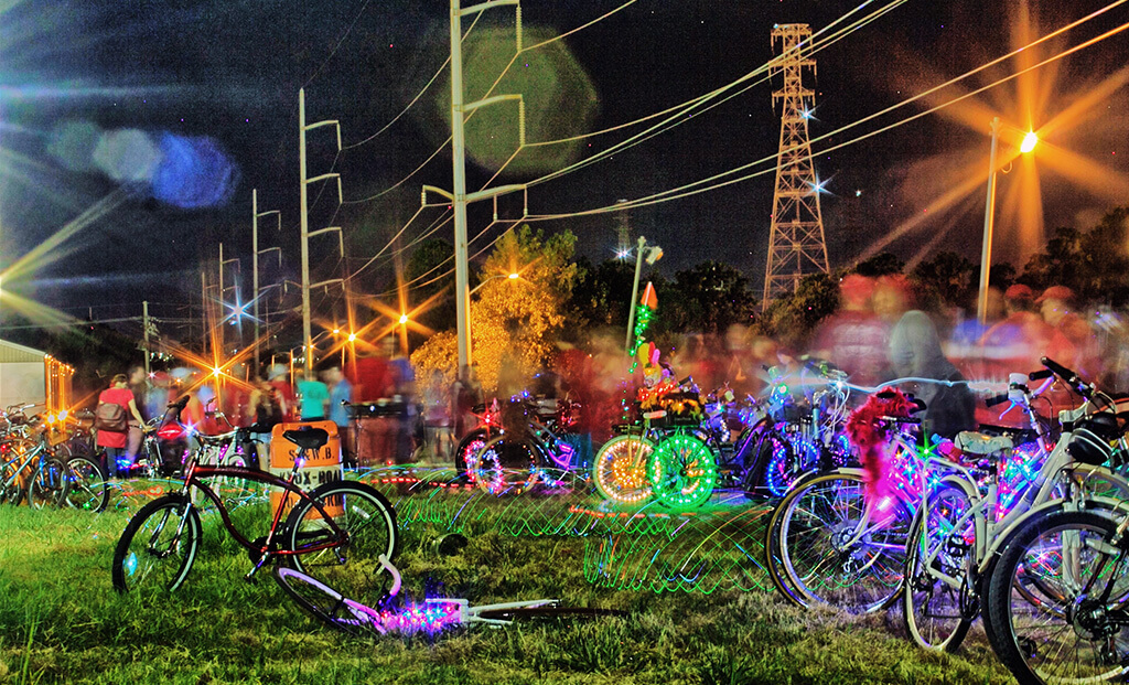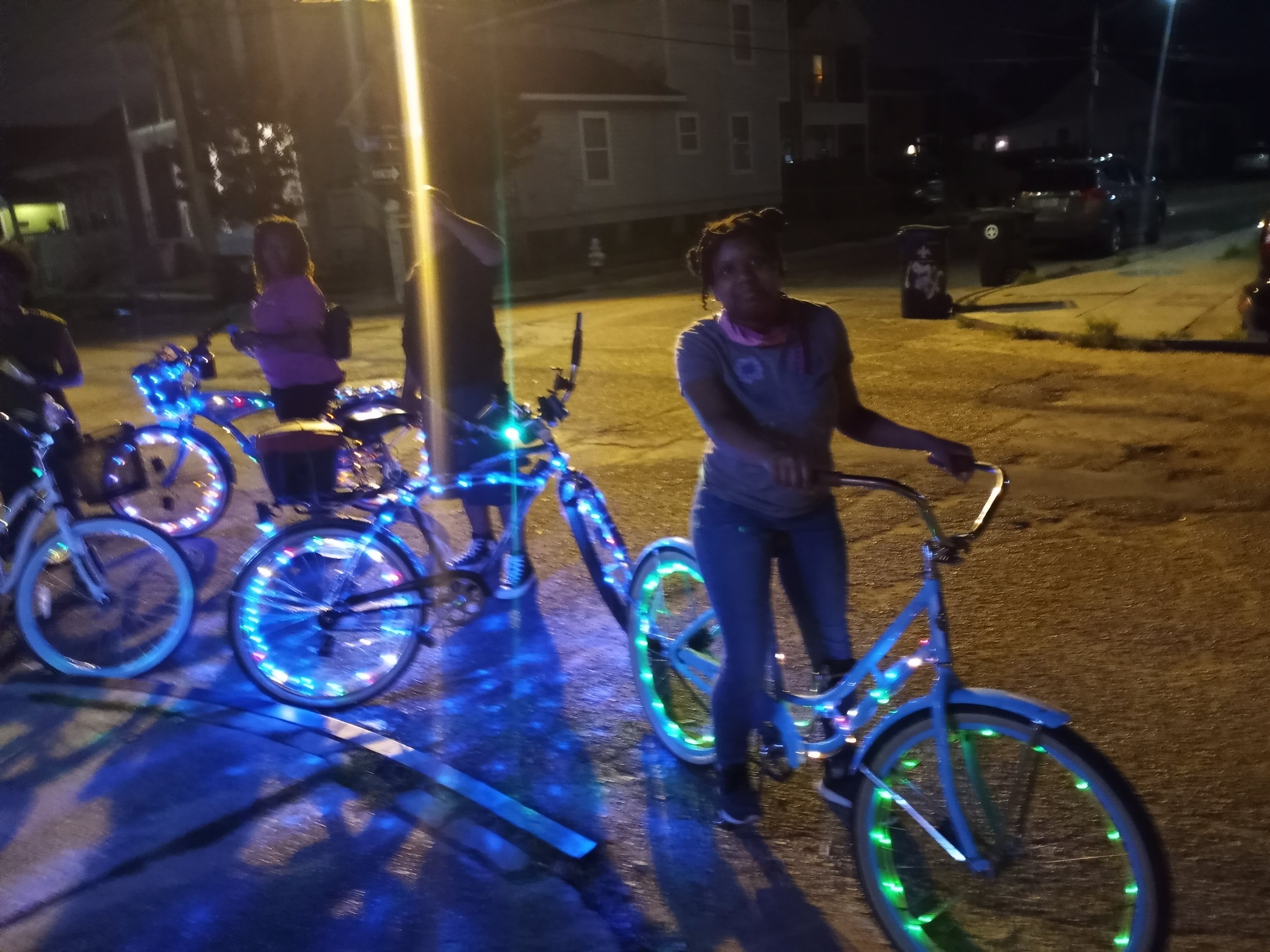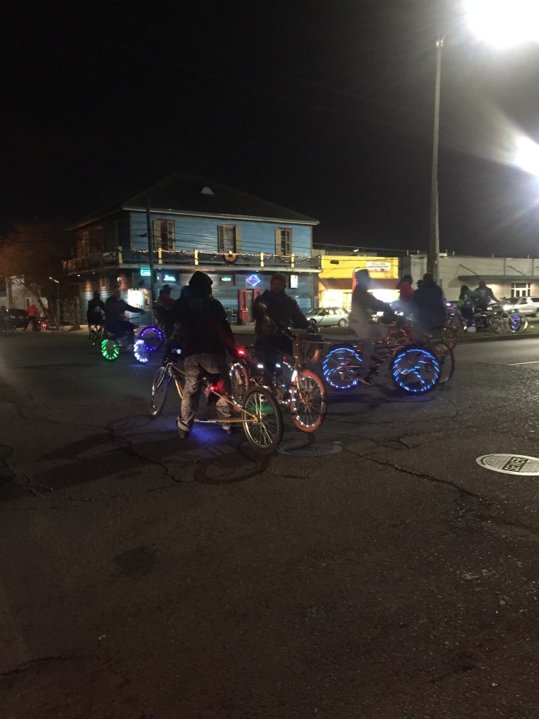My neighbor created a club for our neighborhood called the St. Roch Riders a few years ago. What started with a few neighbors riding through the city on a Tuesday evening is now a group of over forty riders. We light up and ride through the city with New Orleans music blasting through a portable speaker. It’s a total NOLA Vibe. Immagine Impeccably decorated bicycles are lit up from the handlebar to the last spoke in the wheel, with colorful LED lights lighting the way through the streets of New Orleans, making for an outlet for escape and exercise, especially after a hard day.