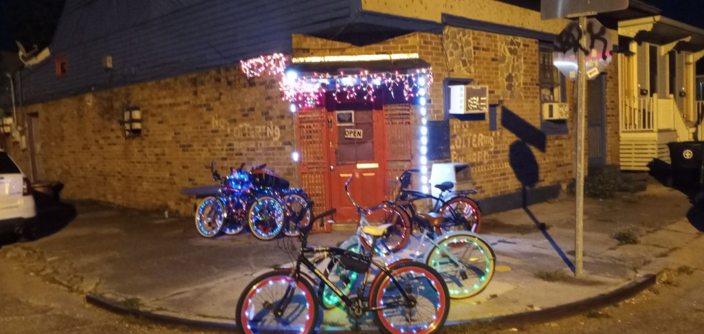 A typical night consists of bar hopping and depending on various neighborhoods. I never thought riding a bike and drinking would make for such an excellent opportunity to get out and socialize, and New Orleans makes the perfect backdrop. If you’re like me, how can one drink, socialize and ride a bike all at once? But it does! And if you can’t keep up, just chant, “Laissez Les bons temps rouler- Let the good times roll!” And keep on rolling!