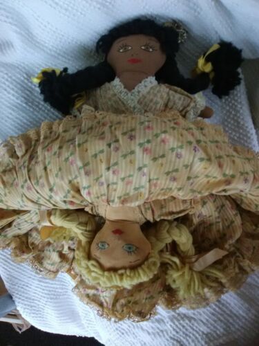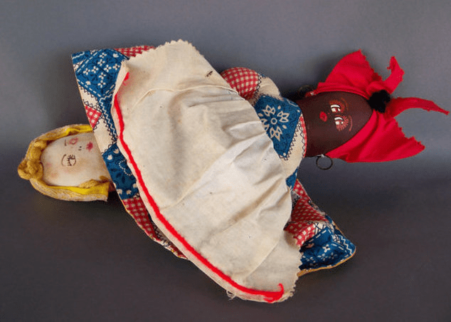 A Topsy-Turvy doll is a double-ended doll, typically featuring two opposing dolls, a white doll with a black mammy doll sewn together at the lower waist where the hips and legs would ordinarily be. It is speculated that these dolls were made for Black children who were forbidden to have black or white dolls. Either way, the doll could be flipped over to hide the opposing forbidden doll from the overseer or enslaver. The issue of the Topsy Turvy Doll continues to be highly debated. I believe the Topsy-Turvy doll was created to invoke the false belief that white was better than black.