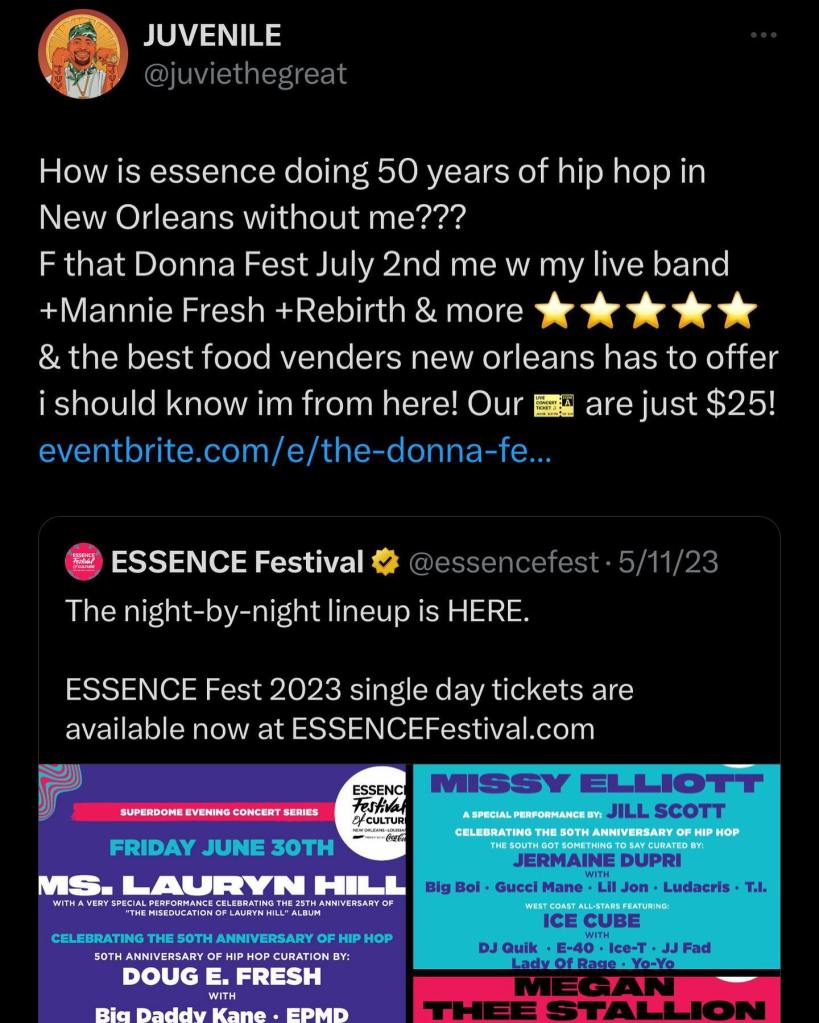 “Hip-Hop 50 without Juvie? Not a chance. June 30th, NOLA we live!” he wrote. “#ESSENCEFEST #ESSENCEFEST2023 #EFOC2023.” Fans can get tickets here.