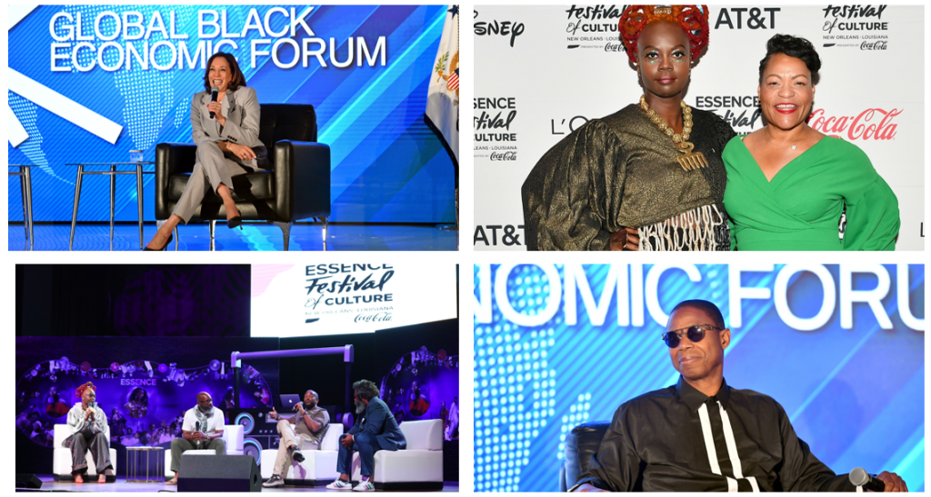 [Top left: Kamala Harris, Vice President of the United States. Top right: ESSENCE Ventures President and CEO, Caroline Wanga, and Mayor of New Orleans, LaToya Cantrell. Bottom left: Caroline Wanga, ESSENCE Ventures President and CEO, Chairman Richelieu Dennis, Revolt’s CEO Detavio Samuels and Group Black Co-Founder & Chief Strategy Officer Bonin Bough. Bottom right: Doug E. Fresh]NEW ORLEANS, LOUISIANA – JUNE 29: A general view of atmosphere during the 2023 ESSENCE Ventures Media Upfronts at The Fillmore New Orleans on June 29, 2023 in New Orleans, Louisiana. (Photo by Arturo Holmes/Getty Images for ESSENCE)NEW ORLEANS, LOUISIANA – JUNE 29: A general view of atmosphere during the 2023 ESSENCE Ventures Media Upfronts at The Fillmore New Orleans on June 29, 2023 in New Orleans, Louisiana. (Photo by Arturo Holmes/Getty Images for ESSENCE)